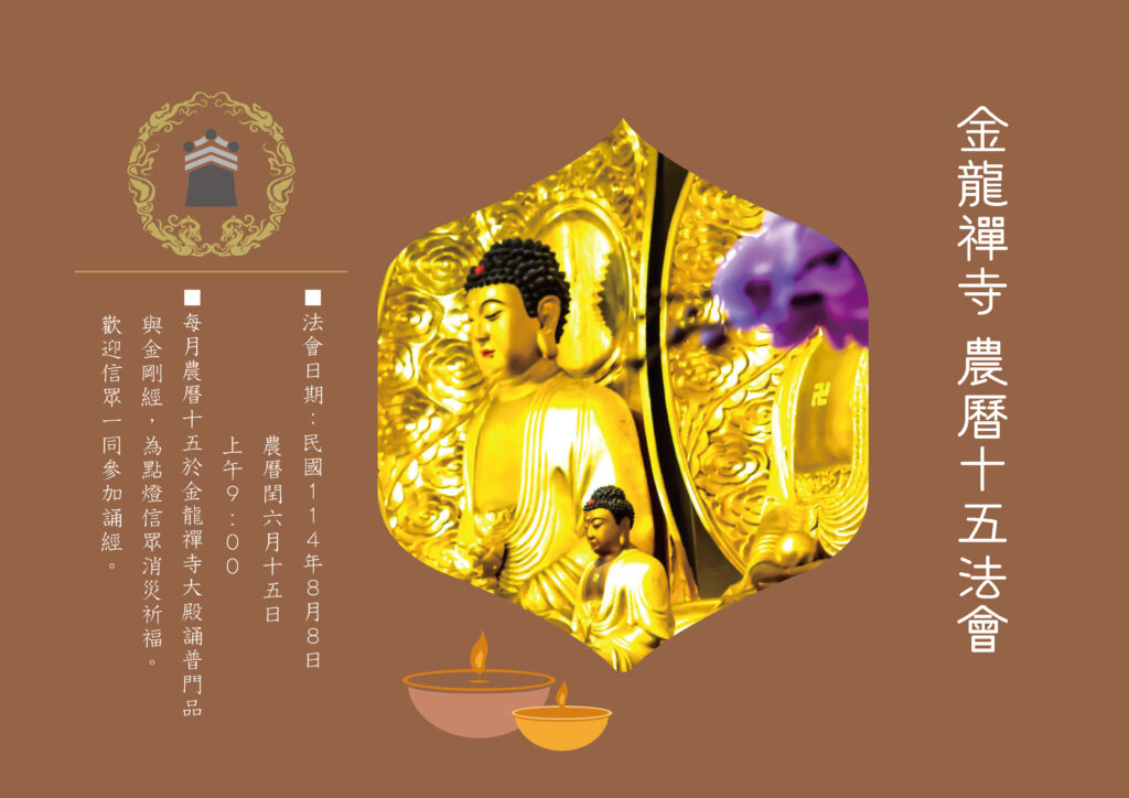 每月農曆十五於金龍禪寺大殿誦普門品與金剛經,為點燈信眾消災祈福。歡迎信眾一同參加誦經。